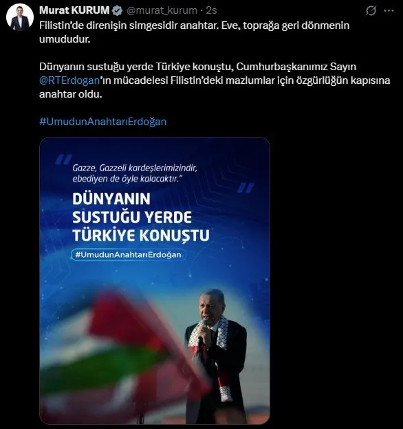 Çevre, Şehircilik ve İklim Değişikliği Bakanı Murat Kurum: Filistin'de direnişin simgesidir anahtar. Eve, toprağa geri dönmenin umududur. Dünyanın sustuğu yerde Türkiye konuştu, Cumhurbaşkanımız Sayın Recep Tayyip Erdoğan'ın mücadelesi Filistin'deki mazlumlar için özgürlüğün kapısına anahtar oldu.