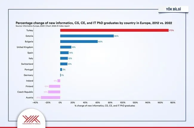 Türkiye ayrıca doktora mezunlarının 2012'den 2022'ye değişiminde yüzde 173'lük oranla ve 100 bin kişi başına düşen bilişim doktora mezunlarının yüzde değişiminde ise yüzde 142'lik oranla 1'inci sırada bulunuyor.