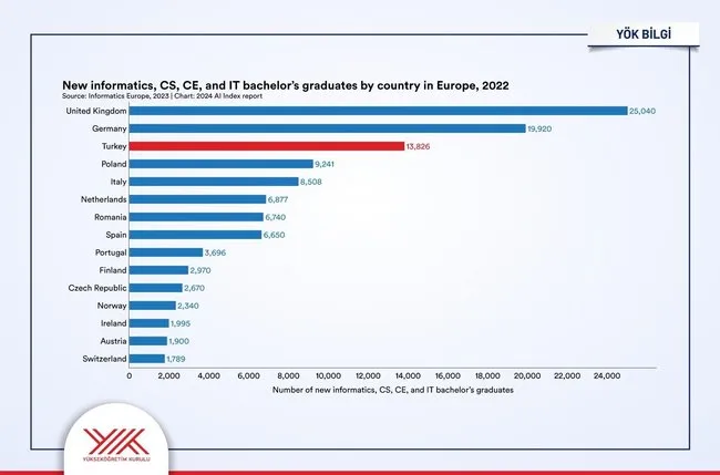 Rapora göre, Avrupa ülkeleri arasında bilişim, bilgisayar bilimi, bilgisayar mühendisliği ve bilgi teknolojisi alanlarında lisans düzeyinde en yüksek mezun sayısı Birleşik Krallık'ta. Onu Almanya ve Türkiye takip ediyor. Avrupa ülkeleri arasında bu alanlarda 2012 ile 2022 yılları lisans mezunu sayıları karşılaştırıldığında ise en yüksek oransal değişim yüzde 153'le Norveç'te gerçekleşirken, onun ardından yüzde 118'lik oranla Türkiye geliyor. Türkiye bu alanlardaki yüksek lisans mezunu sayısında 6'ıncı, doktora mezun sayısında ise 5'inci sırada yer alıyor.