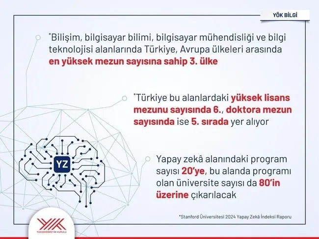 Üniversitenin 2025 yılı için hazırladığı rapor ise Türkiye'nin yapay zekâ alanındaki metrikler açısından küresel ölçekte rekabetçi bir konumda olduğunu da gösteriyor. Rapora göre, Bilgi ve İletişim Teknolojileri alanında kadın-erkek cinsiyet eşitliğiyle öne çıkan Türkiye, ABD ve İspanya'dan sonra bu alanda en fazla önlisans mezunu veren dünyada 3'üncü, Avrupa'da ise 2'nci ülke konumunda yer alıyor. Yükseköğretim Kurulunca geçtiğimiz yıl yapay zekâya dayalı önlisans ve düzeyinde 17 ayrı program 20 farklı üniversitede açılmıştı.