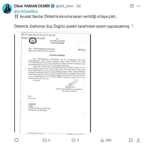 "Avukat Serdar Öktem’e koruma kararı verildiği ortaya çıktı. Öktem’e, Daltonlar Suç Örgütü üyeleri tarafından eylem yapılacakmış"