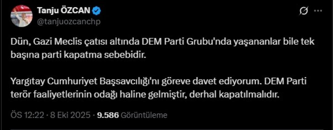Özcan açıklamalarının devamında ise "Yargıtay Cumhuriyet Başsavcılığı'nı göreve davet ediyorum. DEM Parti terör faaliyetlerinin odağı haline gelmiştir, derhal kapatılmalıdır" ifadelerini kullandı.