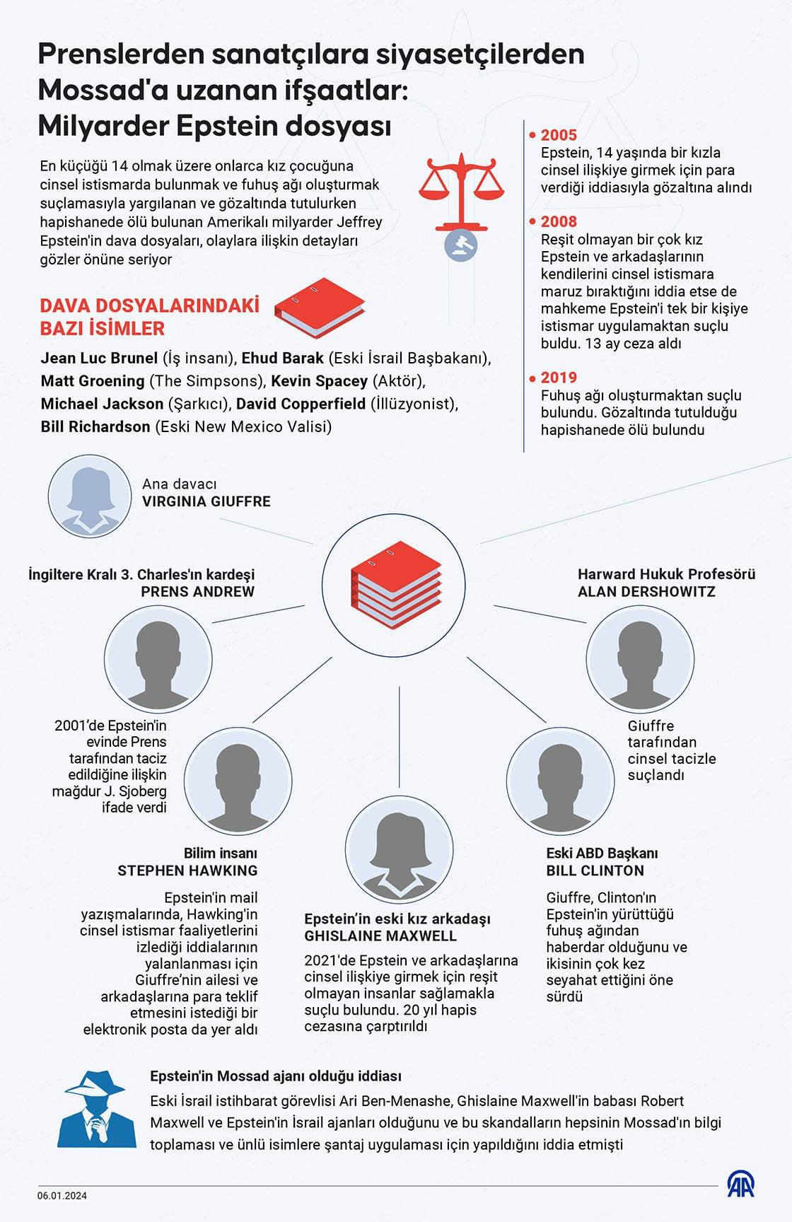 En küçüğü 14 olmak üzere 18 yaş altındaki onlarca kız çocuğuna cinsel istismarda bulunmak ve fuhuş ağı oluşturmak suçlamasıyla yargılanan Epstein, tutuklu olduğu New York Manhattan Metropolitan Merkez Hapishanesi'ndeki hücresinde 10 Ağustos 2019'da ölü bulunmuştu.Açıklanan Epstein dava dosyalarında Prens Andrew, ABD Başkanı Donald Trump, eski ABD Başkanı Bill Clinton, eski İsrail Başbakanı Ehud Barak, eski ABD Başkan Yardımcısı Al Gore, aktör Kevin Spacey, şarkıcı Michael Jackson, illüzyonist David Copperfield, avukat Alan Dershowitz ve eski New Mexico Valisi Bill Richardson gibi ünlü isimler yer almıştı.