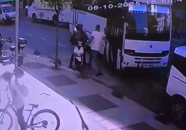 Görüntülerde, seyir halindeki bir servis minibüsünün aniden durarak motosikletli kuryenin yolunu kestiği görülüyor. Minibüsten öfkeyle inen sürücünün, doğrudan kuryenin üzerine yürüyerek tartışmaya başladığı, darbettiği, bıçak çektiği ve gencin motosikletiyle birlikte yere devrildiği anlar da görüntüde yer alıyor.