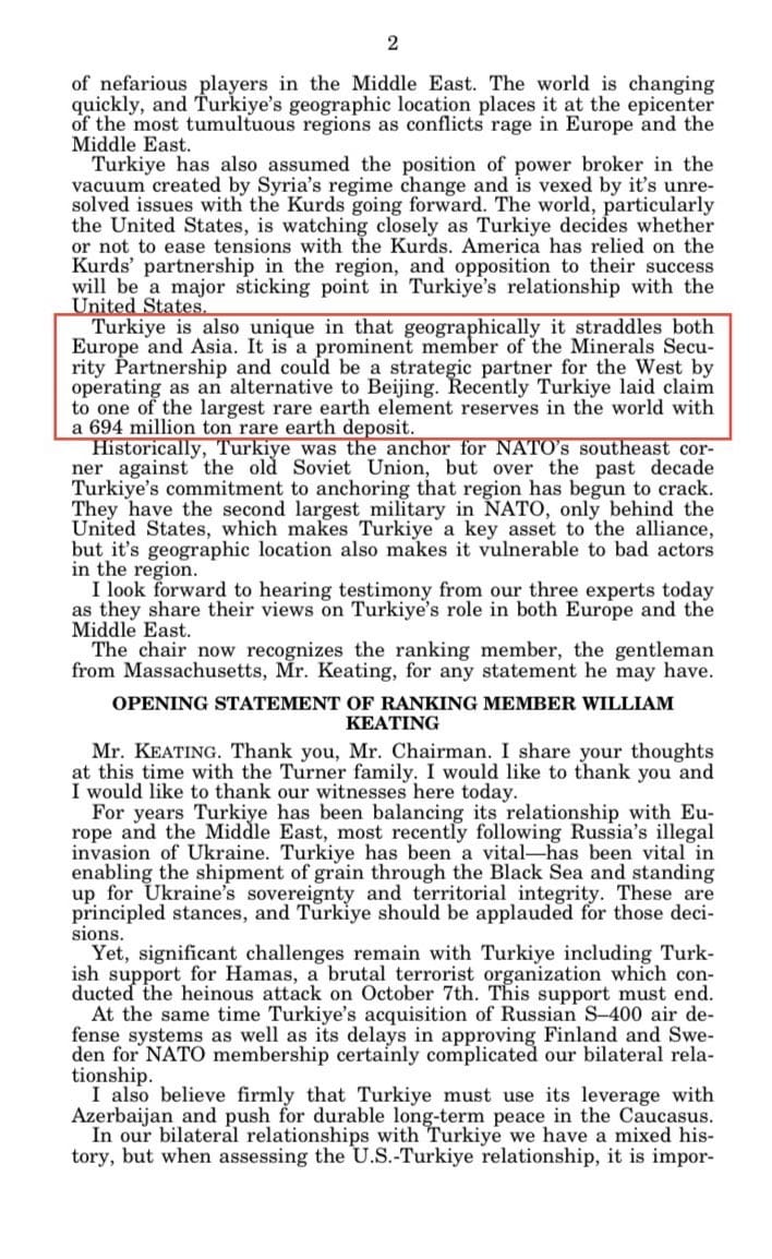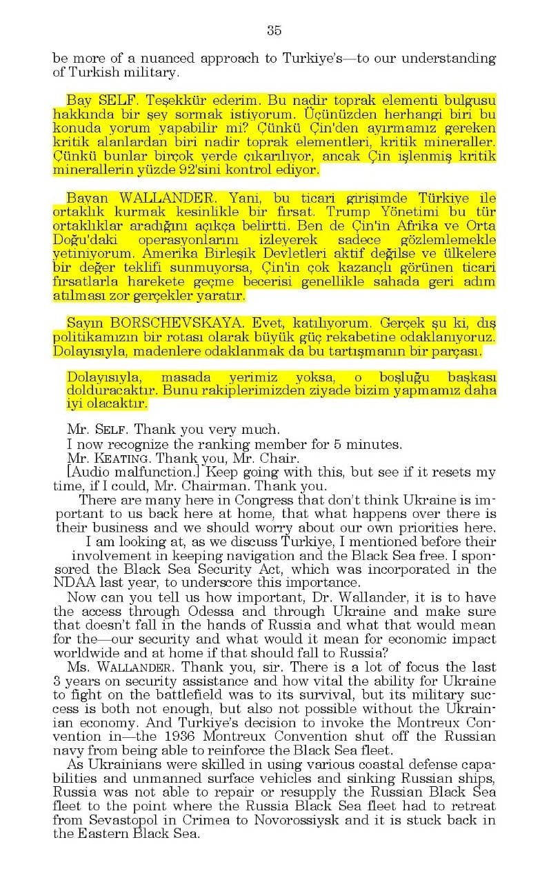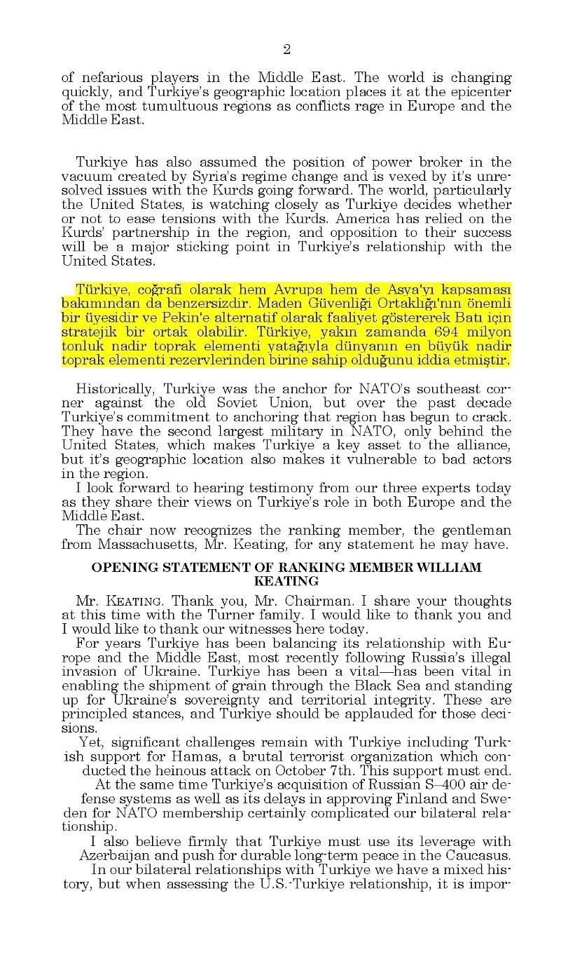 Paylaşıma göre, toplantı tutanaklarında Trump yönetiminin Türkiye’deki 694 milyon tonluk nadir toprak elementi yatağını stratejik bir hedef olarak gördüğü ve Ankara'yı masaya oturtmayı planladığı anlaşılıyor. Nitekim, ABD'li yetkililerin daha önceki açıklamalarında da Türkiye'nin nadir toprak yatakları "stratejik fırsat" olarak nitelendirilmişti.Tutanaklarda, eğer ABD Türkiye ile bir anlaşma yapmazsa, bu "boşluğu başkasının dolduracağı" (Çin kastedilerek) endişesinin dile getirildiği belirtiliyor.Bu nedenle, Türkiye ile masaya oturma rolünü rakiplerden önce ABD'nin üstlenmesinin önemle vurgulandığı iddia ediliyor.Toplantıda Çin'in, dünyadaki işlenmiş kritik minerallerin %92'sini kontrol ettiğine dikkat çekildiği de Yavuzyılmaz'ın paylaştığı notlar arasında yer alıyor.ABD Kongresi'nin resmi kaynakları da 5 Mart 2025'te "Doğu ve Batı arasında Türkiye" başlıklı bir oturum yapıldığını doğruluyor. Oturumda Türkiye’nin NATO’daki rolü, jeostratejik konumu ve nadir toprak rezervlerinin gündeme geldiği biliniyordu.