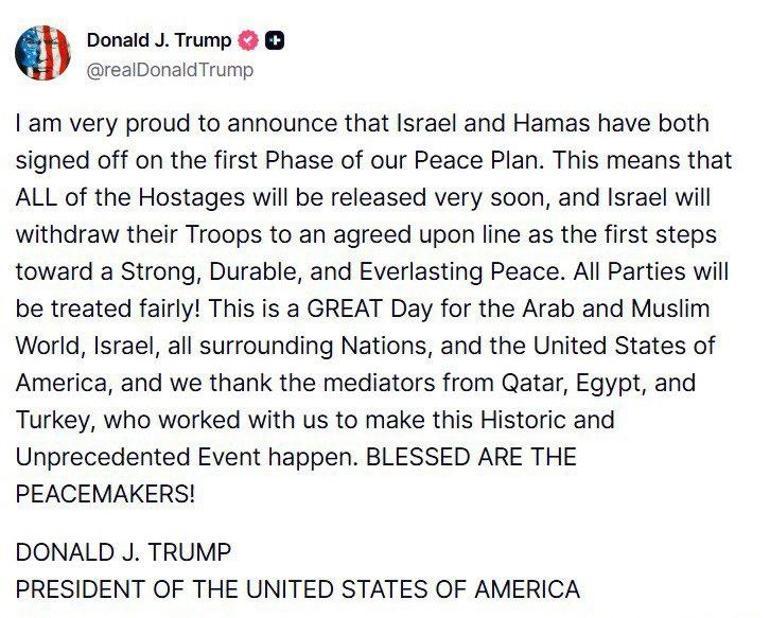 ABD Başkanı Trump, İsrail ve Hamas'ın barış planının ilk aşamasını onayladığını açıkladı. Trump, sosyal medya hesabından yaptığı açıklamada, "İsrail ve Hamas’ın barış planımızın ilk aşamasını onayladıklarını duyurmaktan büyük gurur duyuyorum. Bu, tüm rehinelerin çok yakında serbest bırakılacağı ve İsrail’in anlaşmayla belirlenen hatta kadar askerlerini çekeceği anlamına geliyor. Bu adımlar, güçlü, kalıcı ve ebedi bir barışın ilk adımlarıdır. Tüm taraflara adil davranılacaktır. Bu, Arap ve Müslüman dünyası, İsrail, çevredeki tüm ülkeler ve Amerika Birleşik Devletleri için büyük bir gün. Bu tarihi ve eşi benzeri görülmemiş olayı gerçekleştirmek için bizimle çalışan Katar, Mısır ve Türkiye’den arabuluculara teşekkür ediyoruz. Ne mutlu barış yapanlara" dedi.(DHA)