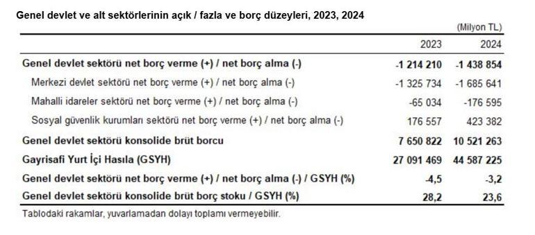 TÜİK, 2024 yılına ilişkin 'Devlet Hesapları' bültenini yayımladı. Buna göre, genel devlet açığı 2024 yılında 1 trilyon 438 milyar 854 milyon TL olarak tahmin edildi ve bir önceki yıl yüzde 4,5 olan genel devlet açığının GSYH'ye oranı yüzde 3,2'ye düştü. Merkezi devlet ve mahalli idareler alt sektörleri 2024 yılında açık verirken, sosyal güvenlik kurumları alt sektörü fazla verdi. Genel devlet konsolide brüt borç stokunun GSYH'ye oranı ise 2024 yılında yüzde 23,6'ya düştü.