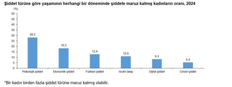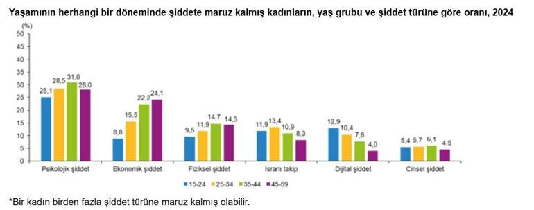 Buna göre; yaşamının herhangi bir döneminde kadınların yüzde 28,2'si psikolojik, yüzde 18,3'ü ekonomik, yüzde 12,8'i ise fiziksel şiddete uğradı. Tüm şiddet türleri yaş grubuna göre incelendiğinde, yaşamının herhangi bir döneminde fiziksel şiddete en yüksek oranda 35-44 yaş grubundaki kadınlar maruz kaldı. Bu yaş grubunu sırasıyla yüzde 14,3 ile 45-59 yaş grubundaki kadınlar, yüzde 11,9 ile 25-34 yaş grubundaki kadınlar takip etti. Yaşamının herhangi bir döneminde maruz kalınan şiddet değerlendirildiğinde, boşanan kadınların yüzde 62,1'i psikolojik, yüzde 42,5'i ekonomik, yüzde 41,5'i ise fiziksel şiddete maruz kalırken; evli kadınların yüzde 26,4'ü psikolojik, yüzde 19,9'u ekonomik, yüzde 11,6'sı ise fiziksel şiddete maruz kaldı. Hiç evlenmeyen kadınların yüzde 25,7'si psikolojik şiddete, yüzde 14,2'si dijital şiddete, yüzde 13,4'ü ise ısrarlı takibe maruz kaldı. Yaşamının herhangi bir döneminde şiddete maruz kalmış kadınlar, şiddeti uygulayan kişilere göre incelendiğinde, dijital şiddette yabancı biri yüzde 62,3 ile ilk sıradayken, eş/eski eş/birlikte olduğu kişi yüzde 15,7 ile ikinci sırada yer aldı. Israrlı takipte ise ilk sırayı yüzde 39,6 ile yabancı biri alırken, ikinci sırayı yüzde 32,1 ile eş/eski eş/birlikte olduğu kişi aldı.