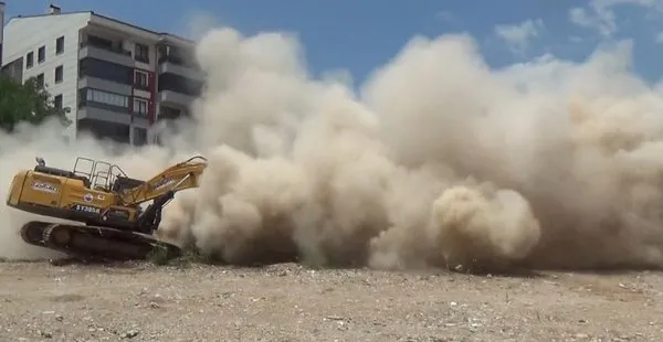 Çalışma alanında incelemelerde bulunan Vali Aygöl, iş makinesine binerek yıkım çalışması gerçekleştirdi. Yıkım esnasında bir binanın çökmesi etrafı tozla kapladı.