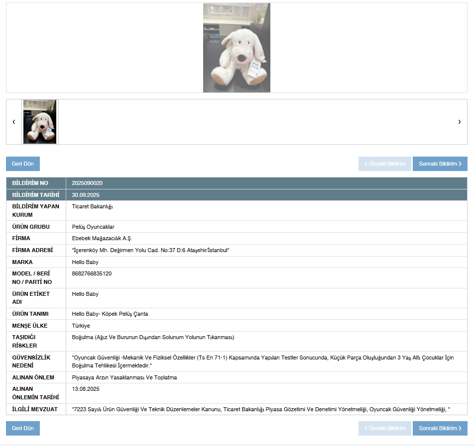 ebebek Mağazacılık A.Ş. tarafından satılan “Hello Baby” markalı köpek peluş oyuncak, yapılan testlerde güvenlik kriterlerini karşılamadığı için güvensiz ürün listesine alındı.