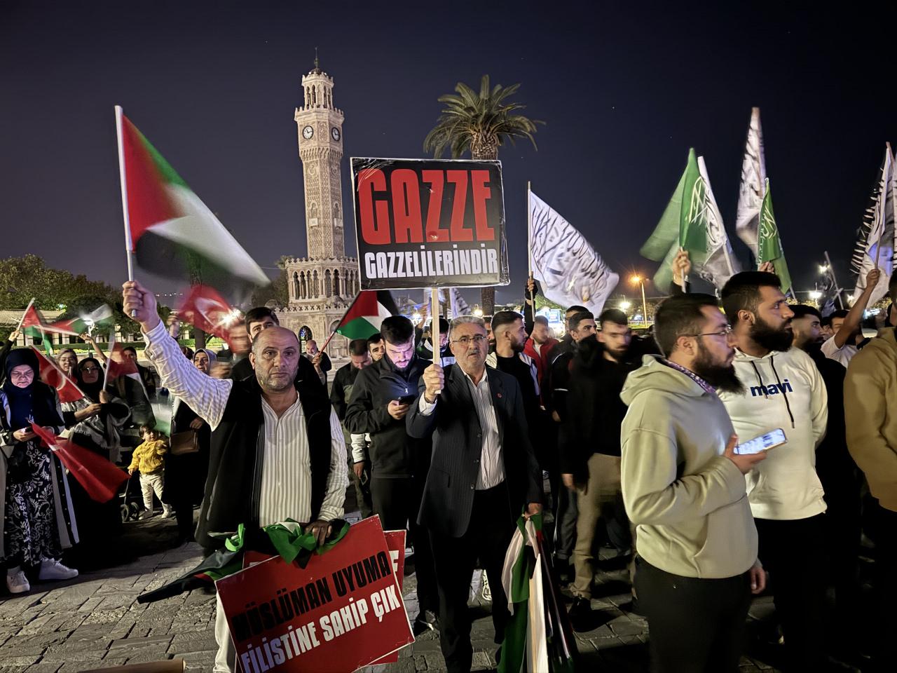 İZMİRİzmir'de Konak Meydanı'ndan toplanan çok sayıda kişi, İsrail aleyhine slogan attı. Ellerindeki Türk ve Filistin bayrakları ile çeşitli pankartlar taşıyan vatandaşlar, tekbir getirdi.