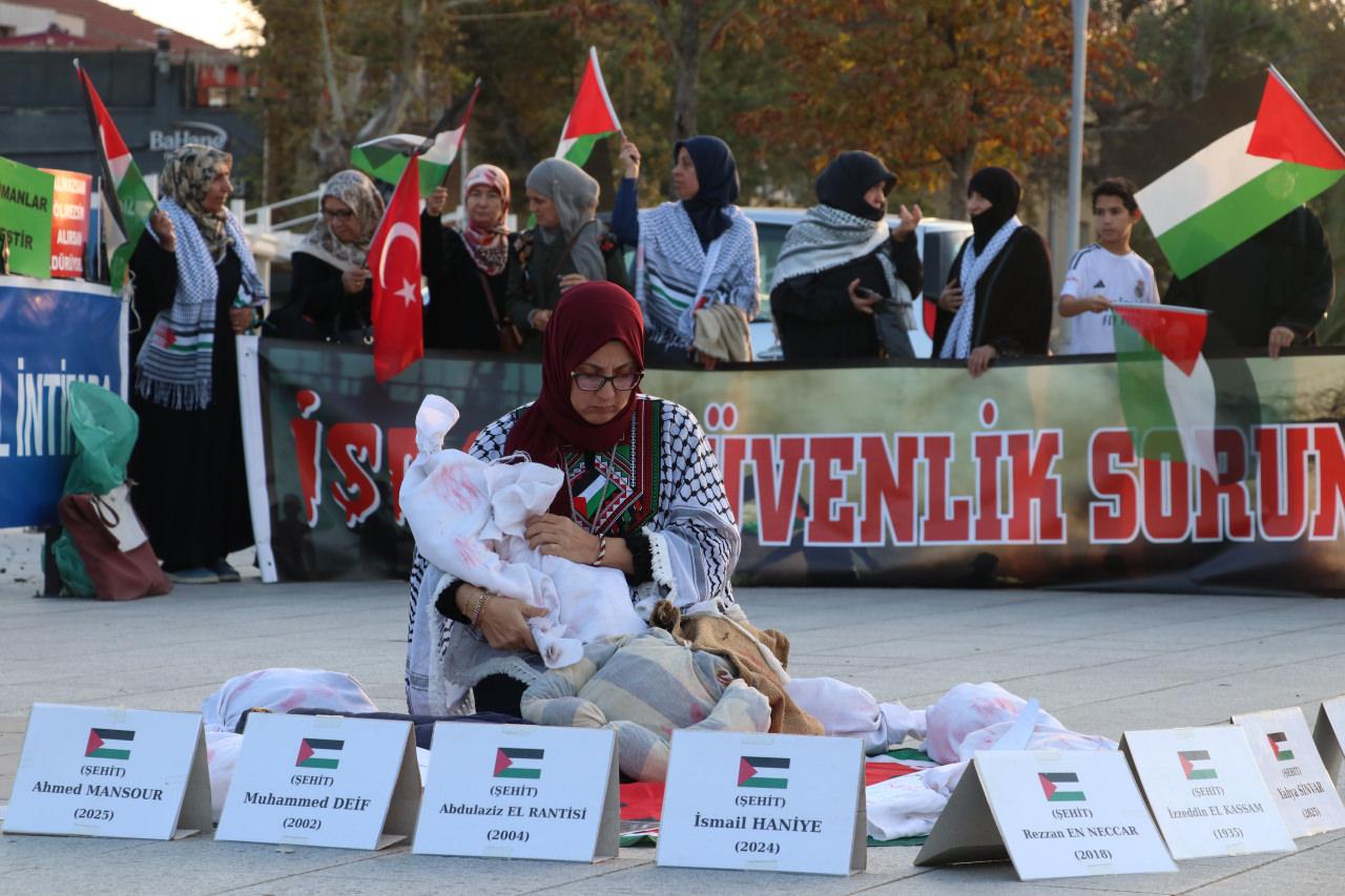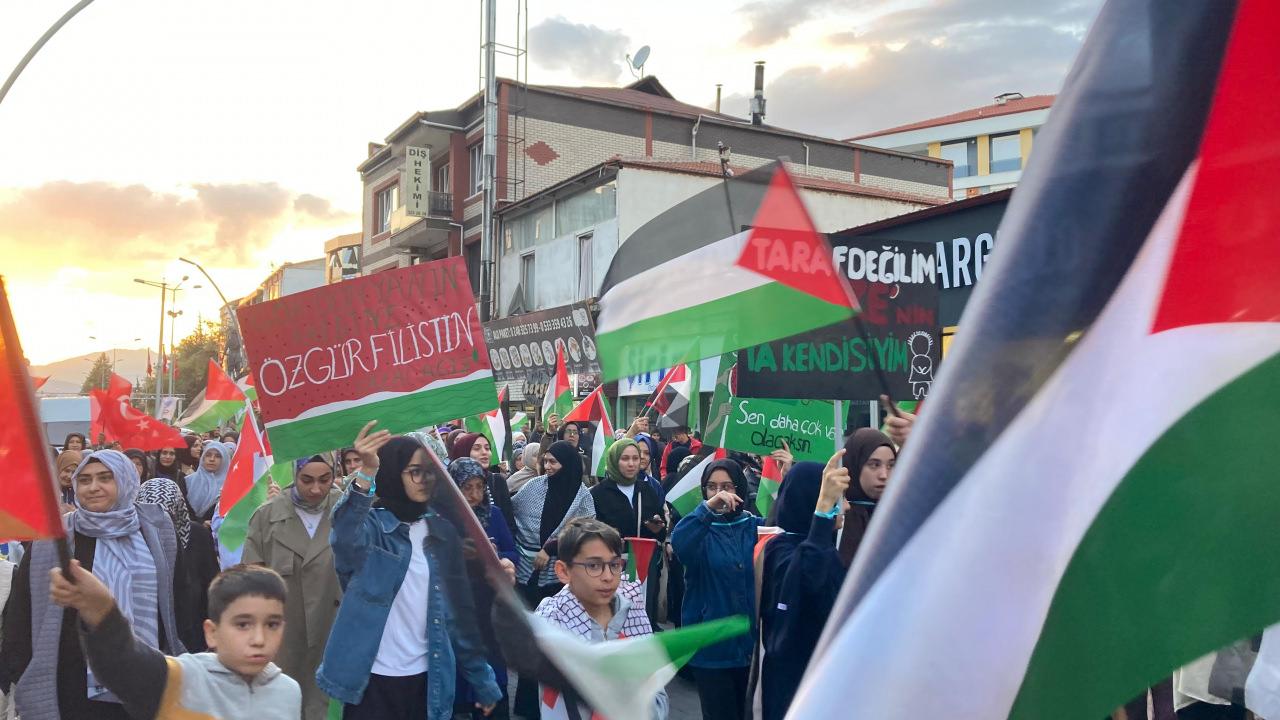 Ellerindeki Türk ve Filistin bayraklarıyla Gar Meydanı'nda toplanan dernek üyeleri ile vatandaşlar, İsrail'in Küresel Sumud Filosu'na düzenlediği saldırıları kınadı.