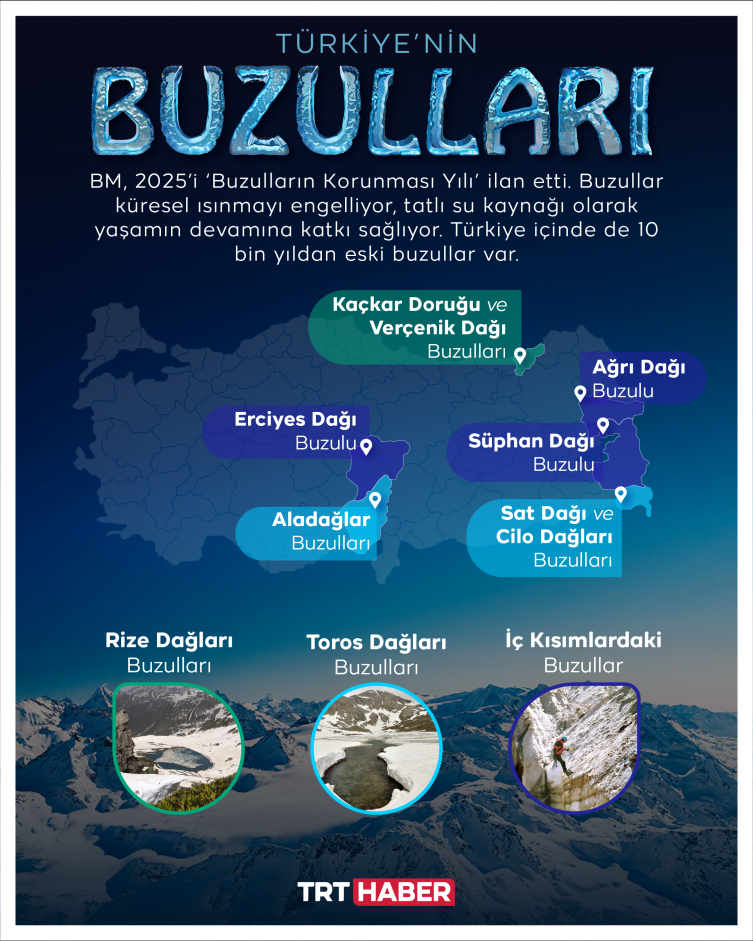 Türkiye’deki buzulların da önemli olduğunu kaydeden Yirmibeşoğlu, “Cilo Dağları'ndaki buzullar, Anadolu’nun en güneydeki buzulları olarak dikkat çekerken; Ağrı Dağı ve Kaçkarlar’daki buzullar da yüksek irtifa ve coğrafi çeşitlilik açısından eşsizdir. Bu buzullar, binlerce yıllık iklim geçmişini katmanlarında saklayan doğal kayıt cihazlarıdır” diyor.