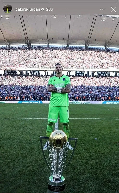 Trabzonspor'un file bekçisi Uğurcan Çakır, bordo-mavili ekibin 2021-2022 sezonundaki Süper Lig şampiyonluğunda kazandığı kupayla çekildiği fotoğrafı paylaşarak, kulübe olan bağlılığını görsel bir mesajla ifade etti.
