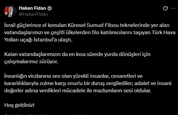 Dışişleri Bakanı Fidan sosyal medya hesabından yaptığı açıklamada, "İsrail güçlerince el konulan Küresel Sumud Filosu teknelerinde yer alan vatandaşlarımızı ve çeşitli ülkelerden filo katılımcılarını taşıyan Türk Hava Yolları uçağı İstanbul'a ulaştı. Kalan vatandaşlarımızın da en kısa sürede yurda dönüşleri için çalışmalarımız sürüyor. İnsanlığın vicdanına ses olan yürekli insanlar, cesaretleri ve kararlılıklarıyla zulme karşı onurlu bir duruş sergilediler; adalet ve insani değerler adına verdikleri mücadele ile mazlumların sesi oldular. Hoş geldiniz!" ifadelerinde bulundu.