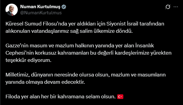 TBMM Başkanı Numan Kurtulmuş da filoda alıkonulan ve ülkeye dönen aktivistler için paylaşımda bulundu. Yaptığı açıklamada, "Küresel Sumud Filosu'nda yer aldıkları için Siyonist İsrail tarafından alıkonulan vatandaşlarımız sağ salim ülkemize döndü. Gazze'nin masum ve mazlum halkının yanında yer alan İnsanlık Cephesi'nin korkusuz kahramanları bu değerli kardeşlerimize yürekten teşekkür ediyorum. Milletimiz, dünyanın neresinde olursa olsun, mazlum ve masumların yanında olmaya devam edecektir. Filoda yer alan her bir kahramana selam olsun." Dedi.