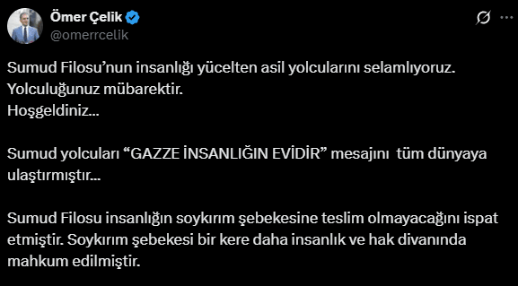 AK Parti Sözcüsü Ömer Çelik ise yaptığı paylaşımda, "Sumud Filosu'nun insanlığı yücelten asil yolcularını selamlıyoruz. Yolculuğunuz mübarektir. Hoşgeldiniz… Sumud yolcuları "GAZZE İNSANLIĞIN EVİDİR" mesajını tüm dünyaya ulaştırmıştır... Sumud Filosu insanlığın soykırım şebekesine teslim olmayacağını ispat etmiştir. Soykırım şebekesi bir kere daha insanlık ve hak divanında mahkum edilmiştir." Dedi.