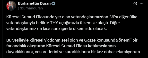 İletişim Başkanı Burhanettin Duran Türkiye'ye dönen Küresel Sumud Filosu aktivistleri için sosyal medya hesabından paylaşımda bulundu. Yapılan paylaşımda, "Küresel Sumud Filosunda yer alan vatandaşlarımızdan 36'sı diğer ülke vatandaşlarıyla birlikte THY uçağımızla ülkemize ulaştı. Diğer vatandaşlarımız da kısa süre içinde ülkemizde olacak. Bu vesileyle küresel vicdanın sesi olan ve Gazze konusunda önemli bir farkındalık oluşturan Küresel Sumud Filosu katılımcılarının duyarlılıklarını, cesaretlerini ve kararlılıklarını bir kez daha selamlıyorum. "ifadelerine yer verdi.