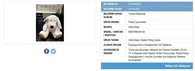 Bakanlık tarafından yapılan açıklamada, ürünün çocuklar için ciddi risk oluşturduğu belirtildi. Söz konusu çantanın toplatılma gerekçesi olarak, "Boğulma (ağız ve burunun dışından solunum yolunun tıkanması)" riski gösterildi.