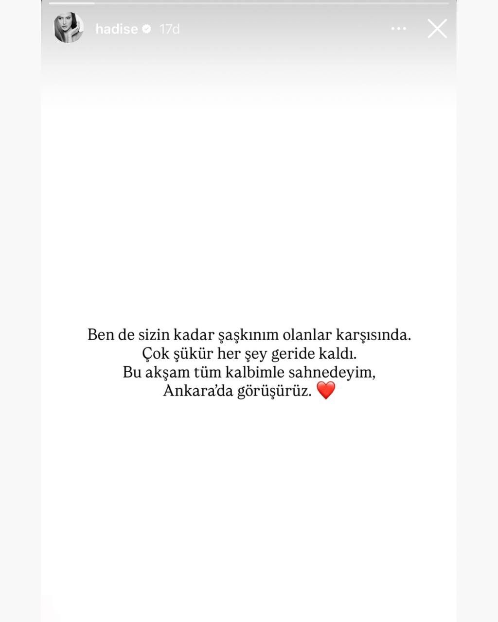 "Ben de sizin kadar şaşkınım olanlar karşısında. Çok şükür her şey geride kaldı. Bu akşam tüm kalbimle sahnedeyim, Ankara'da görüşürüz."