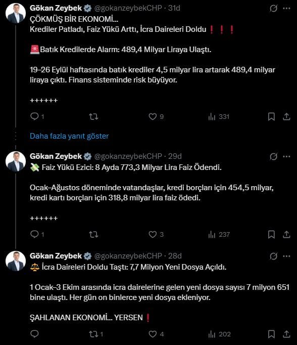"ÇÖKMÜŞ BİR EKONOMİ"CHP Genel Başkan Yardımcısı Gökan Zeybek sosyal medya hesabından yaptığı açıklamada, "Çökmüş bir ekonomi. Krediler Patladı, Faiz Yükü Arttı, İcra Daireleri Doldu Batık Kredilerde Alarm: 489,4 Milyar Liraya Ulaştı. 19–26 Eylül haftasında batık krediler 4,5 milyar lira artarak 489,4 milyar liraya çıktı. Finans sisteminde risk büyüyor" ifadelerini kullandı.