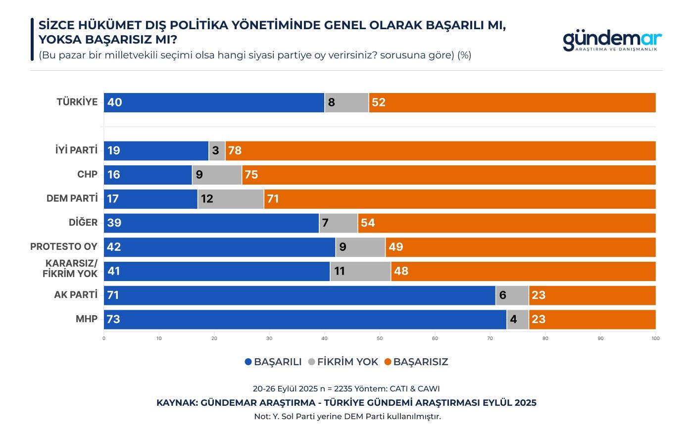 'AKP DIŞ POLİTİKADA BAŞARISIZ'Katılımcıların yüzde 52’si dış politika yönetimi konusunda AKP hükümetini başarısız, yüzde 40’ı başarılı buldu.