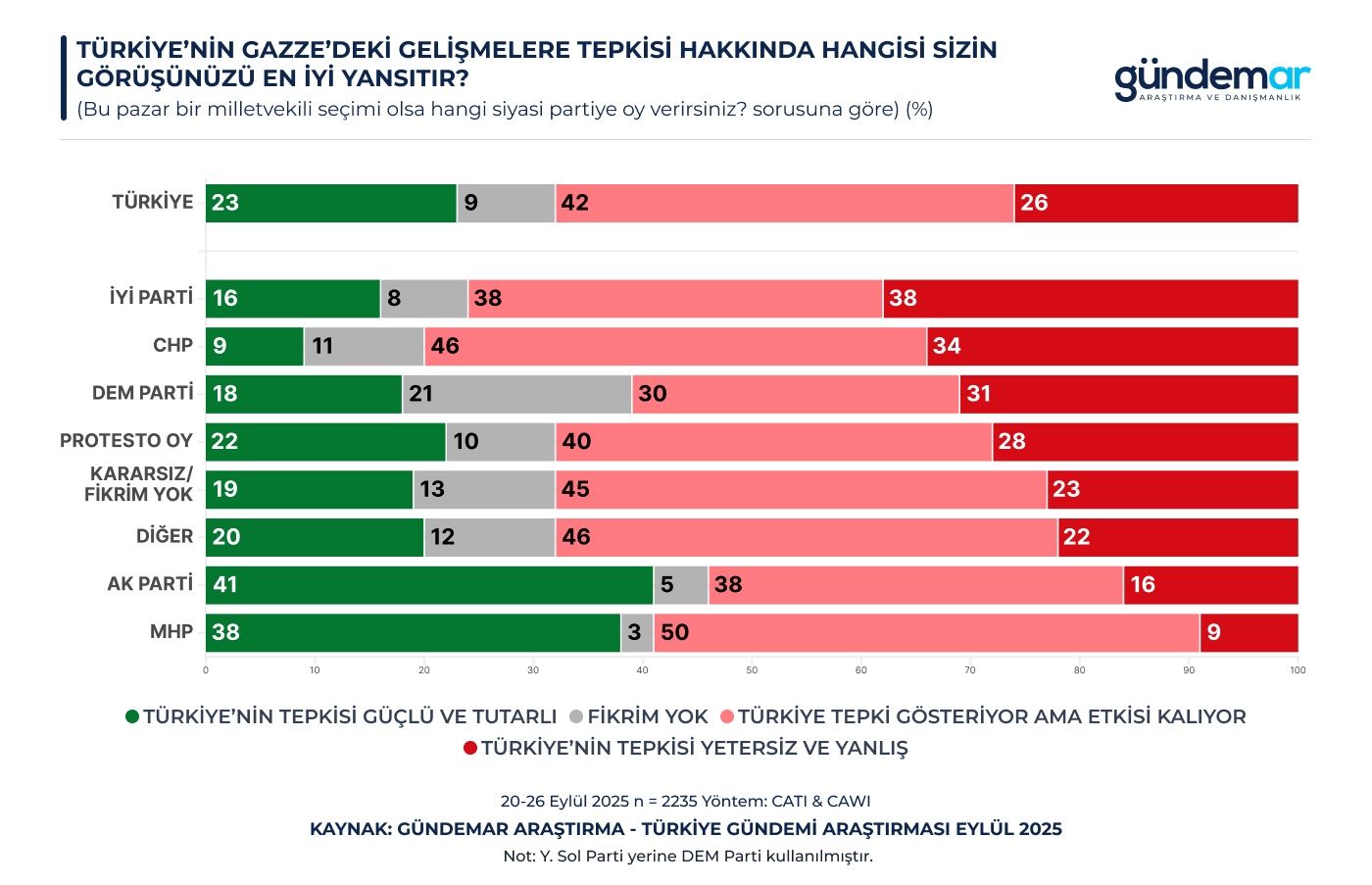 Türkiye’nin Gazze’deki gelişmelere yönelik tepkisini katılımcıların yüzde 42’si etkisiz buldu. Ankete katılanların yüzde 26’sı ise bu politikaları yetersiz ve yanlış bulurken yüzde 23'lük bir kesim güçlü ve tutarlı buldu.