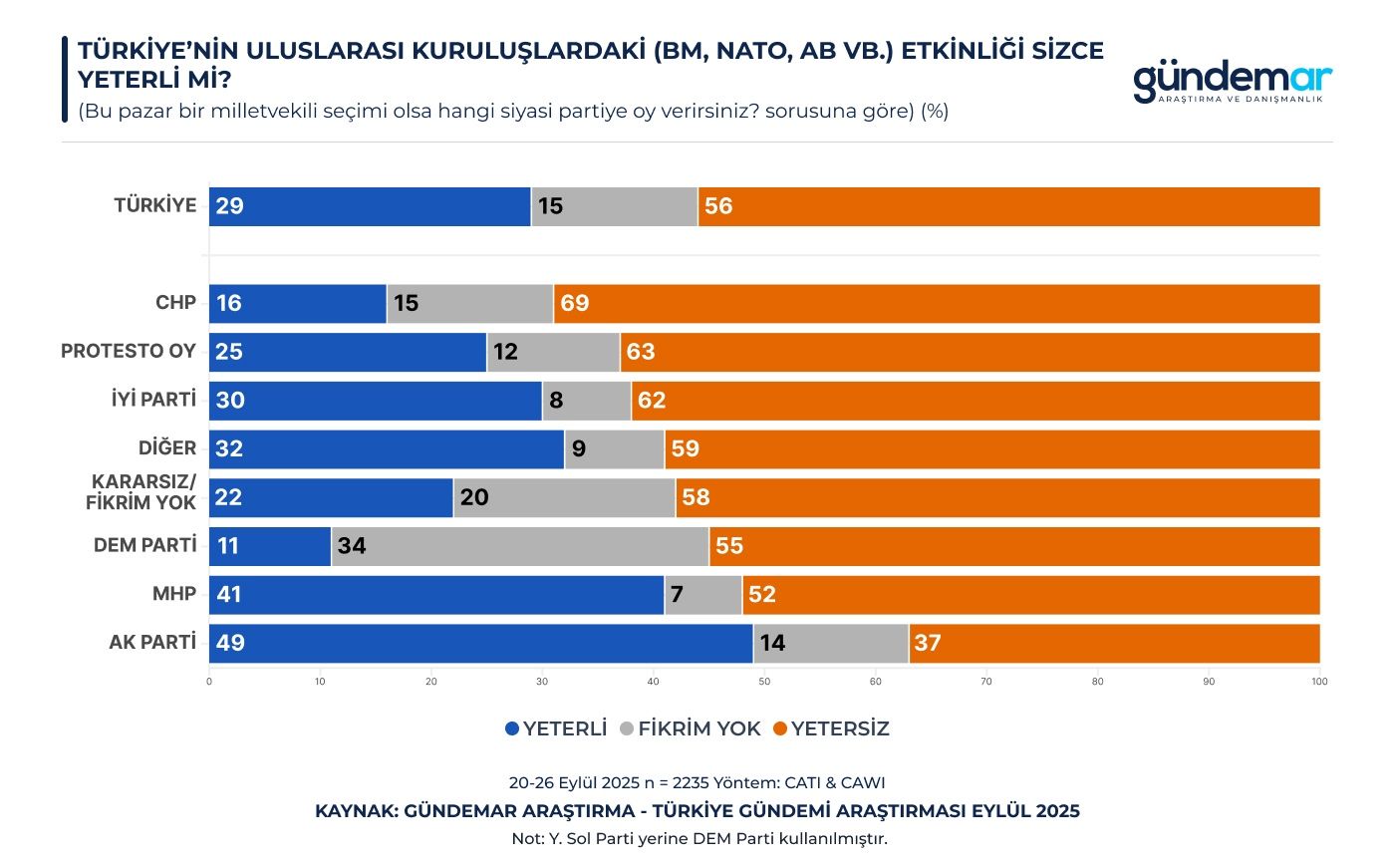 Türkiye genelinde katılımcıların yüzde 56’sı Türkiye’nin BM, NATO ve AB gibi uluslararası kuruluşlardaki etkinliğini “yetersiz” buldu. Bu kapsamda Türkiye'nin etkinliğini yeterli bulanların oranı ise yüzde 29'da kaldı. Buna göre katılımcıların yüzde 71'i Türkiye'yi uluslararası kuruluşlarda tatmin edici derecede etkin bulmuyor.