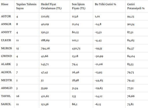 ForInvest Haber'in 30 aracı kurum ve bankanın yayınladıkları araştırma, şirket, strateji raporlarından derlediği gelecek 12 aya ilişkin hedef fiyatlara göre, en yüksek getiri potansiyeli sunan hisse Astor oldu. En az 2 hedef fiyat tahmini alan 82 hisse bu raporda değerlendirmeye alındı.