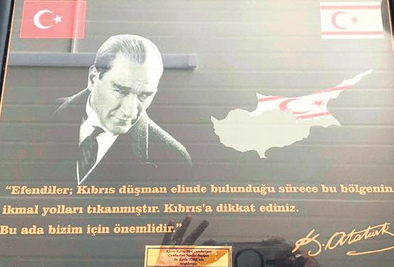 Türk bayrağı... KKTC bayrağı... Atatürk'ün fotoğrafı... Kıbrıs haritası... Ve yazı: "Efendiler; Kıbrıs düşman elinde bulunduğu sürece bu bölgenin ikmal yolları tıkanmıştır... Kıbrıs'a dikkat ediniz... Bu ada bizim için önemlidir."