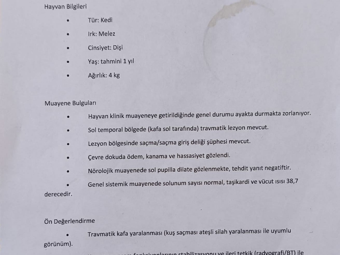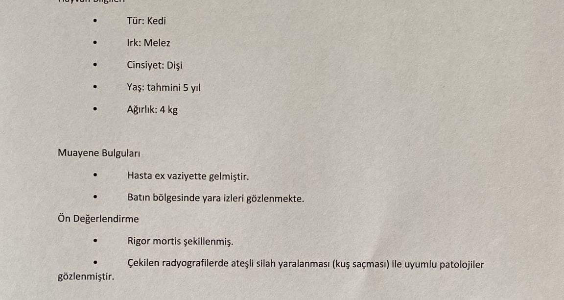KLİNİK RAPORU ‘SAÇMAYA BAĞLI ÖLÜM’2025 yılında çevre sakinlerinden Hüseyin Bülbül, elleriyle büyütüp baktığı kedilerinin art arda ölü bulunmasının ardından cesetleri özel bir kliniğe götürdü. Klinik raporunda, “ateşli silah yaralanması ile uyumlu patolojiler” tespit edildiği, hayvanların saçma (tüfek saçması) sonucu öldüğüne ilişkin bulgulara yer verildiği bildirildi. Evlerine güvenlik kamerası takan mahalleli, K.G. adlı komşularından şüphelendi. Görüntülerde, K.G.’nin bahçesine giren bazı kedilerin aniden kaçtığı, bazılarının aynı yerde hayatını kaybettiği ve ölü kedilerden tüfeğe bağlı saçma parçaları çıktığı iddia ediliyor.