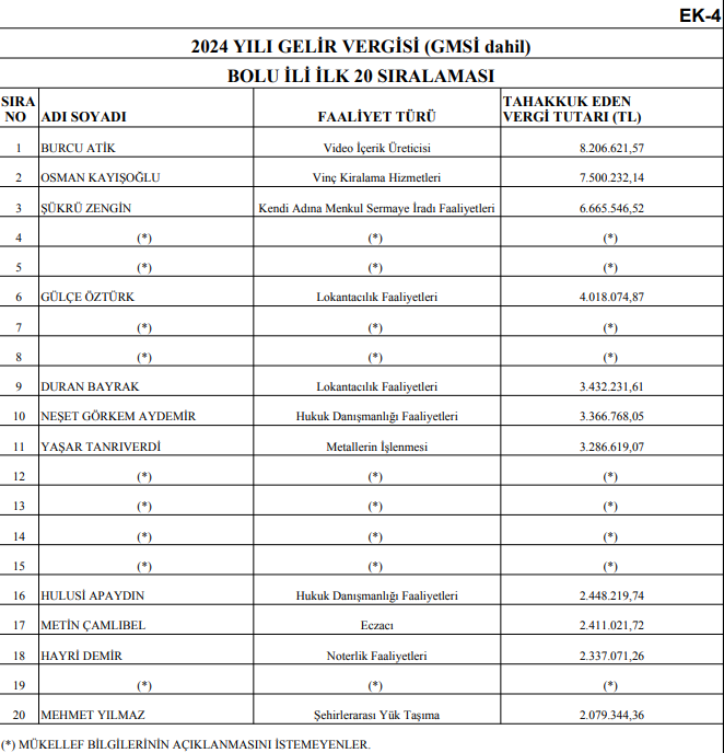 İkinci sırada 7,5 milyon TL ile vinç kiralama hizmetleri alanında faaliyet gösteren Osman Kayışoğlu olurken; üçüncü sırada ise 6,6 milyon TL ile menkul sermaye iradı faaliyetleri yürüten Şükrü Zengin yer aldı.